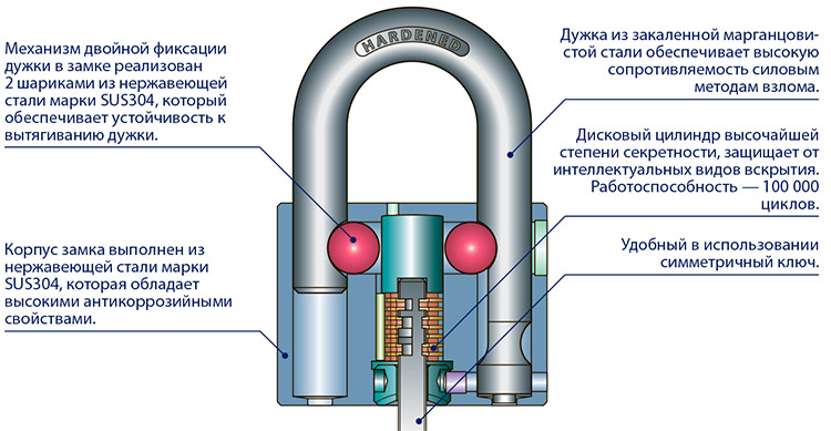 Не менее важным стало применение в конструкции дискового механизма секретности, что призвано исключить вскрытие манипуляционным методом. Сами диски выполнены из нержавеющей стали марки SS 304, поэтому не закисают и не ржавеют с годами даже при прямом контакте с влагой. В комплекте - 5 оригинальных по форме ключей из латуни, они надежны и удобны в использовании. Чтобы исключить случайную потерю или незаметную кражу ключа, он вынимается только из закрытого замка.