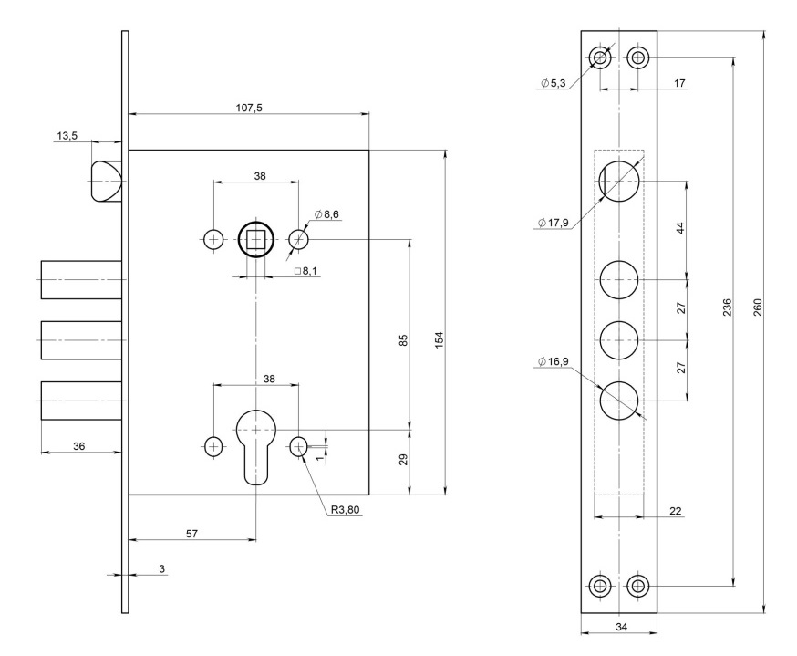 3 цилиндрических стальных ригеля с вылетом 36 мм и диаметром - 16,9 мм.