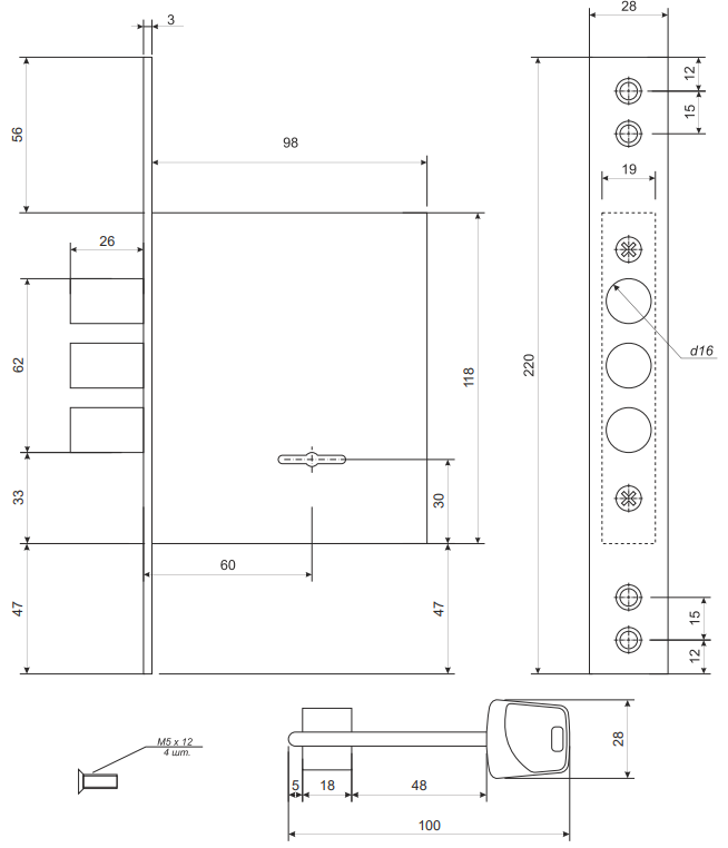 Материал замка и ключей — сталь, антикоррозийная обработка защищает механизм при неблагоприятных условиях эксплуатации, увеличивая срок службы. Лицевая планка в форме прямоугольника аккуратно обрамляет отверстие для ключа. Накладка никелированная. В комплект входит 4 ключа.