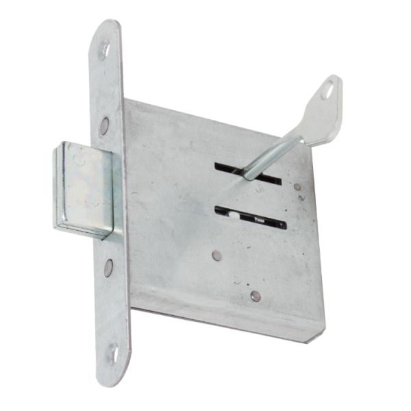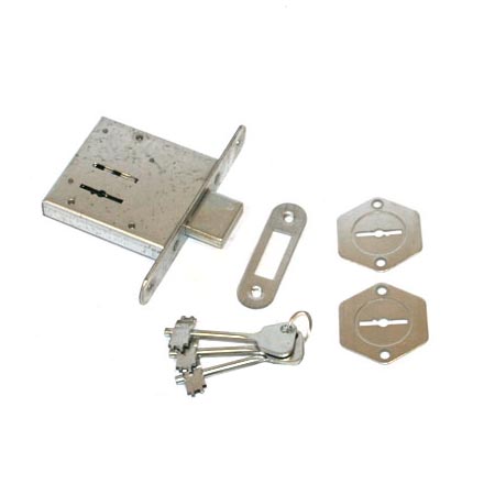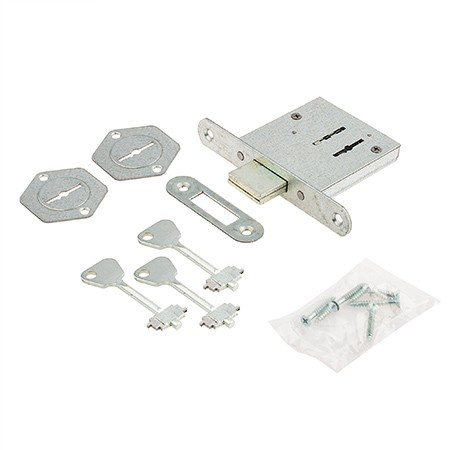 Материал замка и ключей — сталь. Лицевая планка с круглыми концами аккуратно обрамляет отверстие для ключа. Цвет накладки — серебристый. В комплект входит запорная планка и 3 ключа.