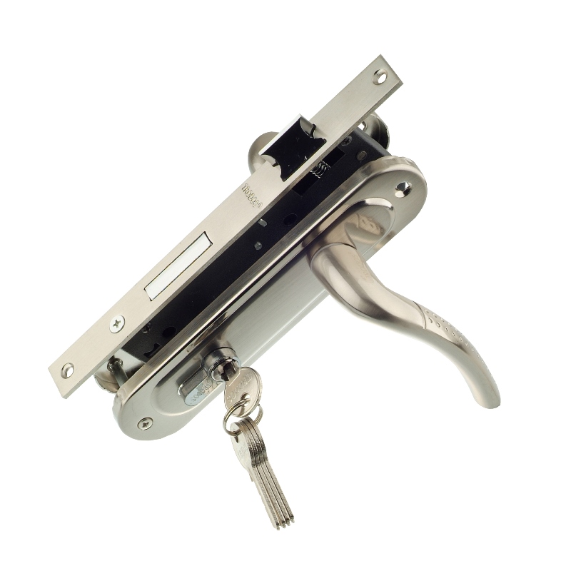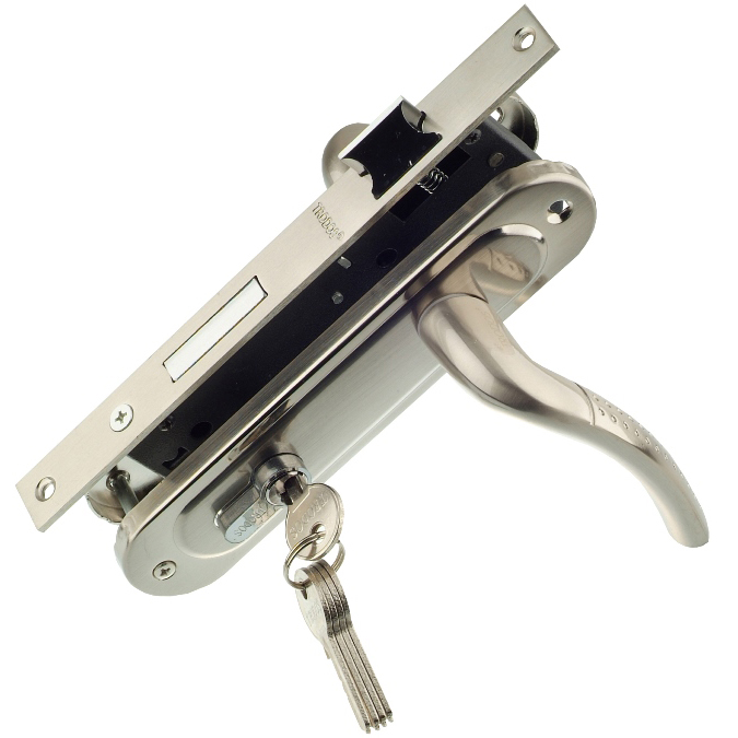 - Комплектация: цилиндровый механизм 60 мм, ключ-ключ, 5 ключей, ответная планка, винтовые стяжки.