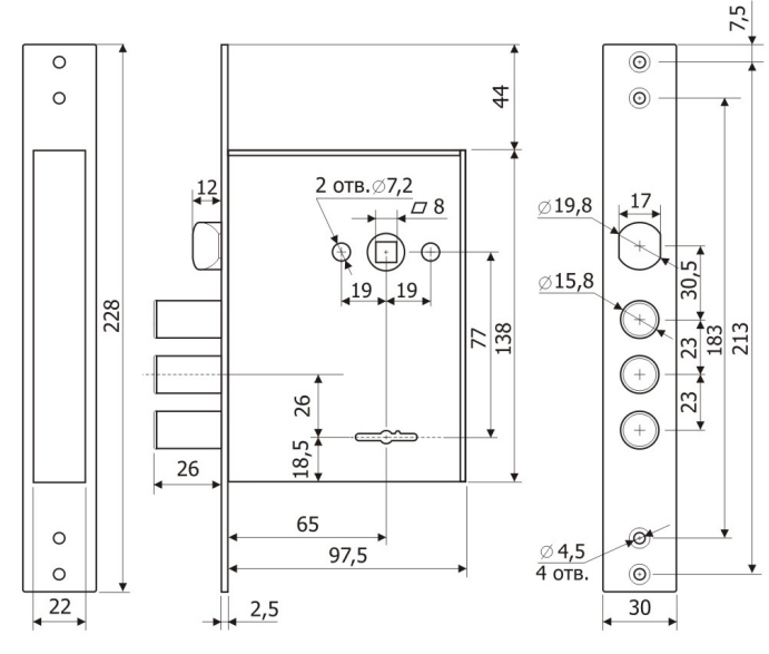 - Защита от взлома – при полностью выдвинутых ригелях замка, 30% их длины остается в корпусе замка, усилена конструкция засовов