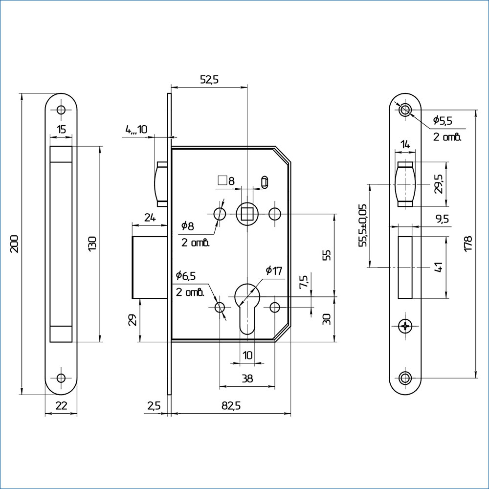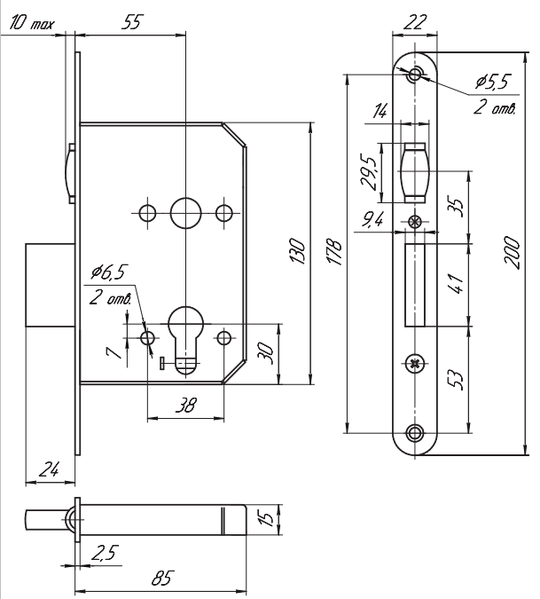 Модель ЗВ5 501.0.0 комплектуется стальными лицевой и запорной (ответной) планками, а также двумя декоративными накладками из нержавеющей стали и винтом М5Х60 для крепления цилиндрового механизма.
