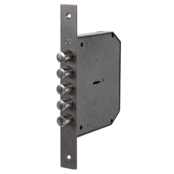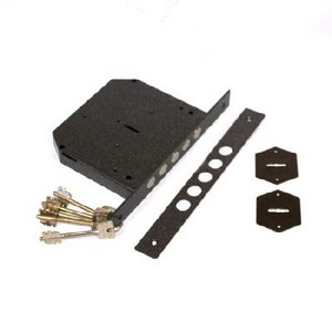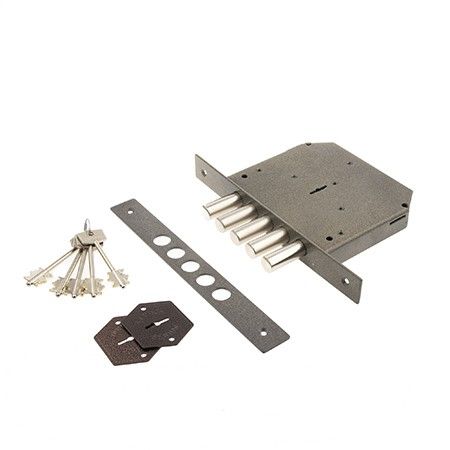 Материал замка и ключей — сталь, антикоррозийная обработка защищает механизм при неблагоприятных условиях эксплуатации, увеличивая срок службы. Лицевая планка в форме прямоугольника аккуратно обрамляет отверстие для ключа. В комплект входит запорная планка и 4 ключа.