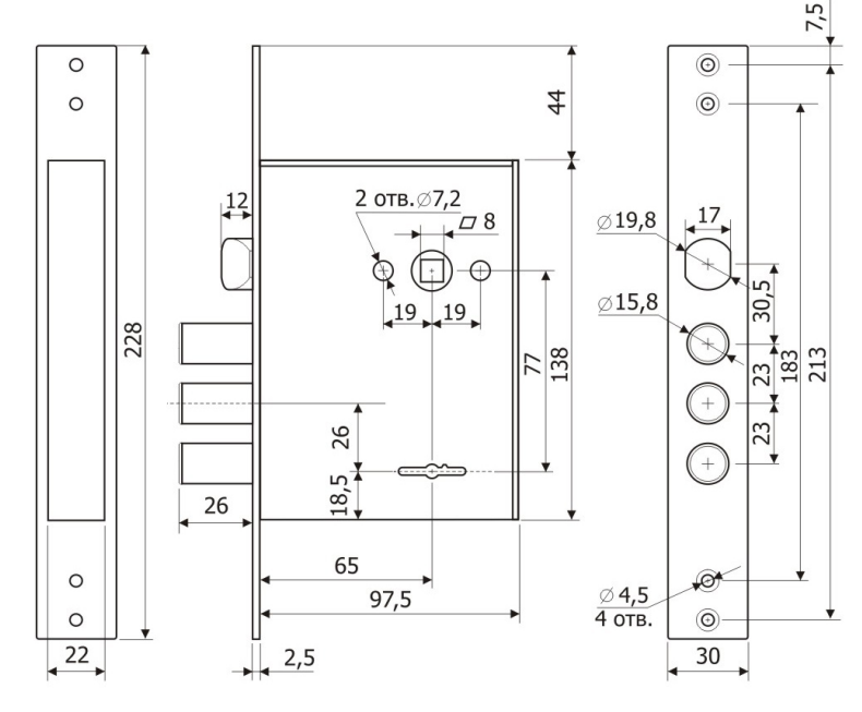 - Защита от взлома – при полностью выдвинутых ригелях замка, 30% их длины остается в корпусе замка, усилена конструкция засовов