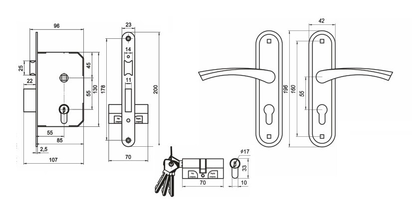 В комплекте: цилиндровый механизм 70 мм, 4 ключа, ответная планка и винтовые стяжки.