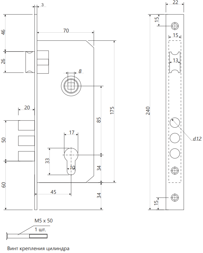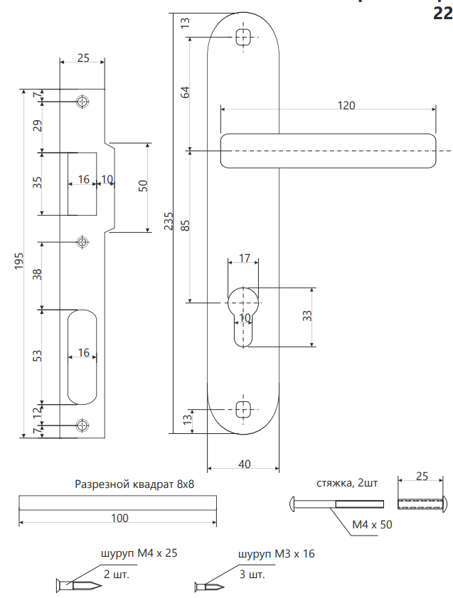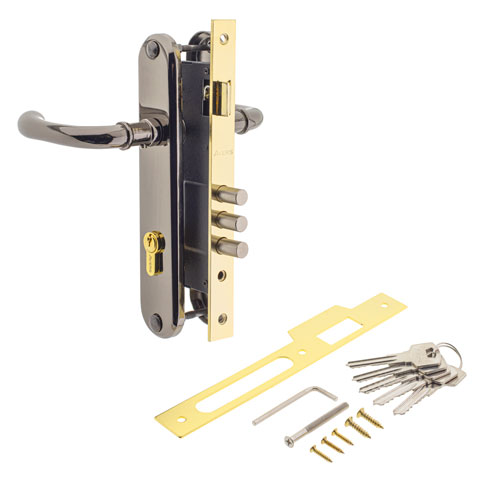 Действует за счет 3-х ригелей цилиндрической формы, выходящих из механизма на 20 мм. Эта модель разработана для входных и межкомнатных дверей толщиной 35-40 мм. Помимо замка, в комплект включены алюминиевые ручки и цилиндр из ЦАМ. Они, как и лицевая планка, покрыты защитно-декоративным слоем гальваники. Тип ключей – английские. Всего их в наборе 5 шт. Для удобства запирания изнутри предусмотрена универсальная защелка.