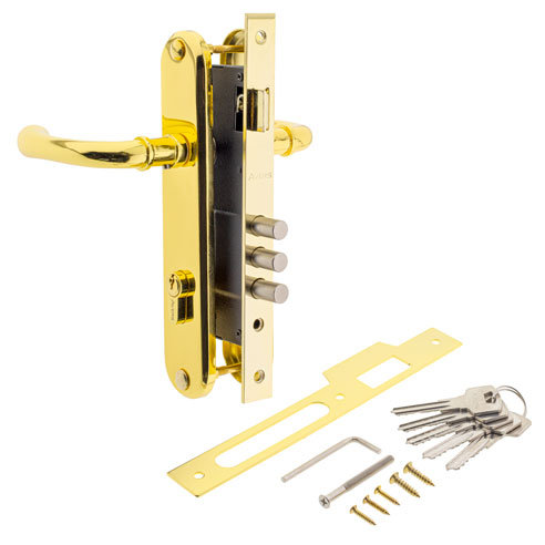 Действует за счет 3-х ригелей цилиндрической формы, выходящих из механизма на 20 мм. Эта модель разработана для входных и межкомнатных дверей толщиной 35-40 мм. Помимо замка, в комплект включены алюминиевые ручки и цилиндр из ЦАМ. Они, как и лицевая планка, покрыты защитно-декоративным слоем гальваники. Тип ключей – английские. Всего их в наборе 5 шт. Для удобства запирания изнутри предусмотрена универсальная защелка.