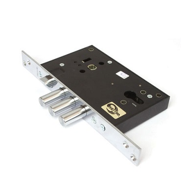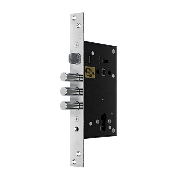 Замок ЗВ4 713.0.0 запирает дверь на три оборота тремя ригелями диаметром 16 мм, которые выдвигаются из корпуса замка на 36 мм. Один из ригелей оснащен закаленным скользящим стержнем, что является хорошей защитой от перепиливания. Корпус повышенной жесткости усилен втулками, что позволяет крепить броненакладку. Съемная лицевая планка дает возможность устанавливать замок как вкладной. Оснащен усиленным фиксатором ригельной планки. Замок имеет защелку.