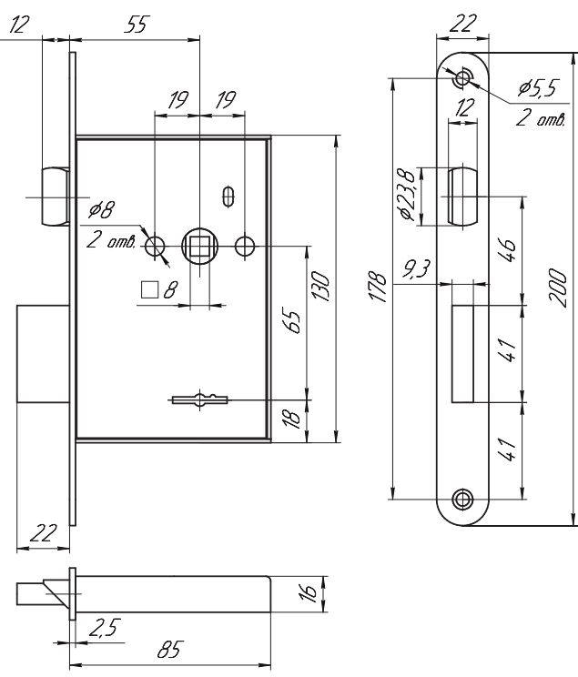 Замок имеет одно направление запирания - стальным прямоугольным ригелем, который выдвигается из корпуса замка на 22 мм. Запирание происходит на 2 полуоборота. Модель ЗВ9 901.0.0 снабжена защёлкой, что позволяет использовать этот замок в качестве основного запирающего устройства. Может быть установлен в стальные и деревянные двери.