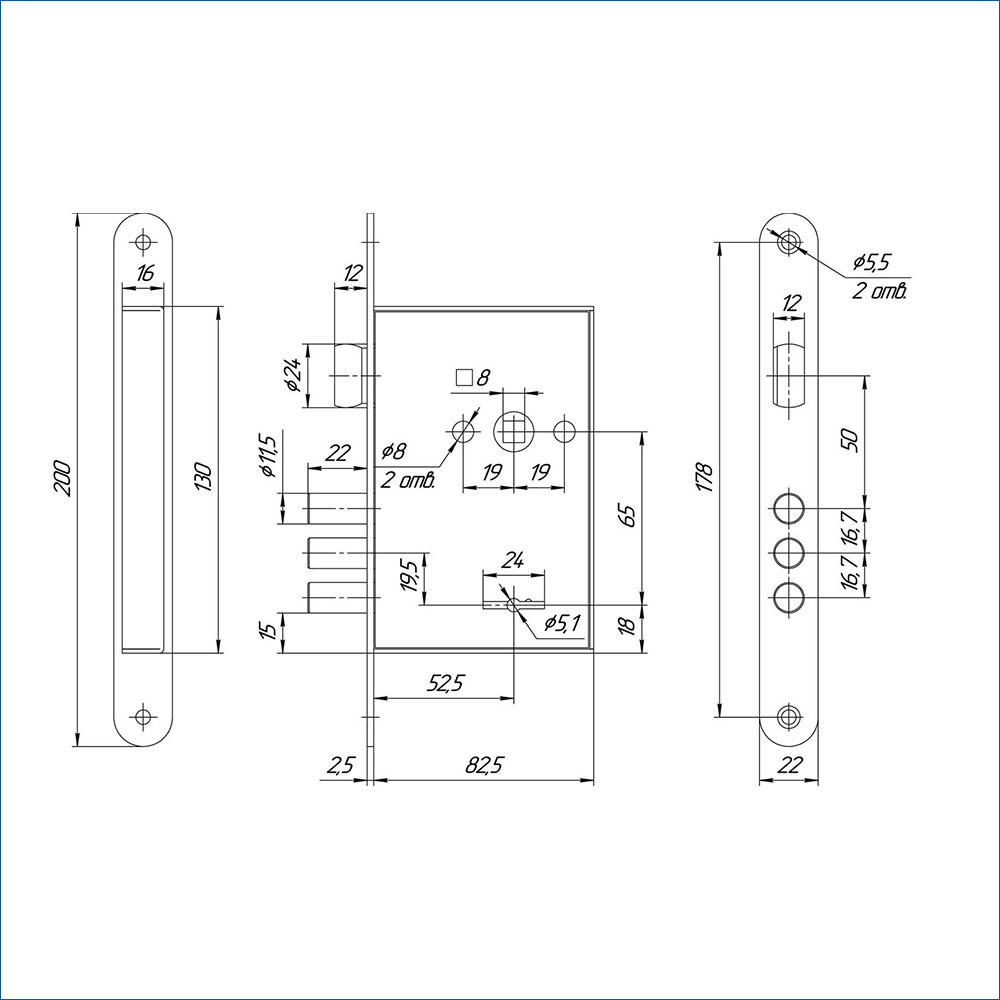 Замок комплектуется стальной лицевой планкой, а также пятью латунными ключами с пластиковой головкой.