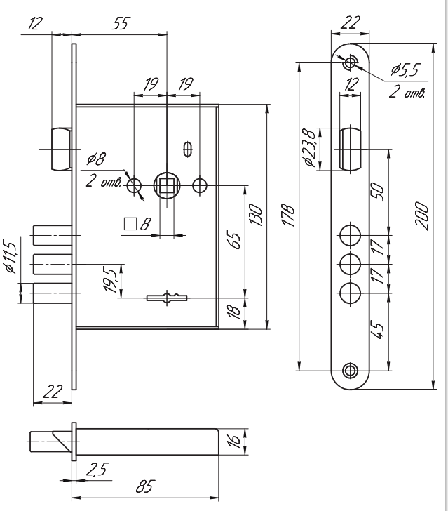 Замок имеет одно направление запирания - тремя стальными ригелями диаметром 12 мм, которые выдвигаются из корпуса замка на 22 мм. Запирание происходит на 2 (два) полуоборота. Модель ЗВ9 902.0.0 снабжена защёлкой, что позволяет использовать этот замок в качестве основного запирающего устройства. Может быть установлен в стальные и деревянные двери.