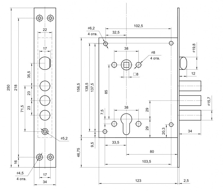 - 3 круглых ригеля диаметром 15,7 мм и вылетом - 36 мм
