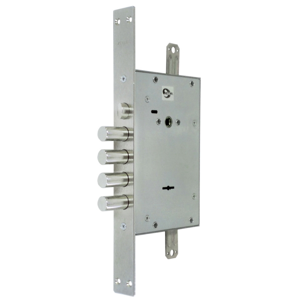 Замок запирает дверь четырьмя стальными ригелями диаметром 18 мм, которые выдвигаются из корпуса замка на 36 мм. В одном из ригелей - закаленный стальной стержень, обеспечивающий защиту от перепиливания.