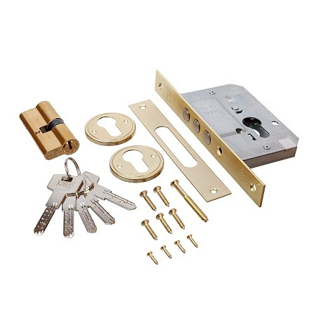 Без защелки, без задвижки, с прямоугольной лицевой планкой 2,5 мм, с 3 круглыми ригелями диаметром 12 мм и вылетом в 2 оборота на 20 мм, с бэксетом 45 мм, в комплект включены ответные планки и декоративные накладки на ключевину и цилиндровый механизм Kale Kilit латунный 62(26+10+26) с 5 английскими ключами.