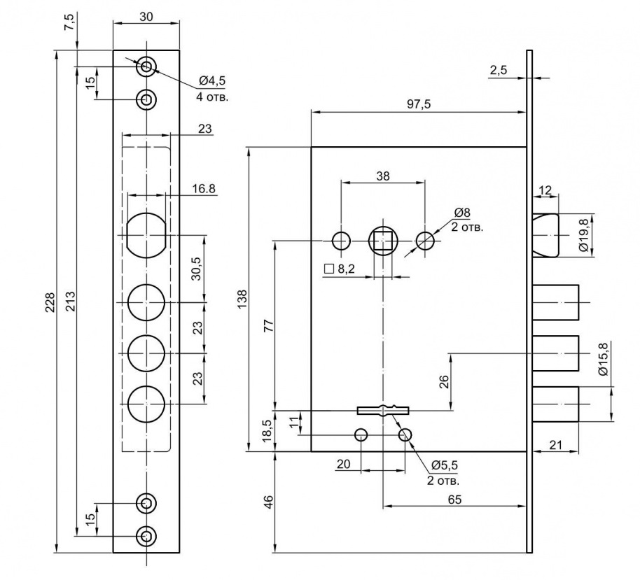 - 3 ригеля с вылетом 21 мм и диаметром - 15.8 мм.