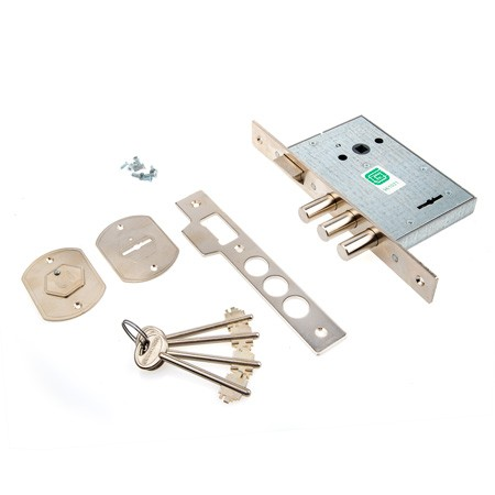 Помимо замка в комплект входят 4 ключа, ответная планка и накладка на замочную скважину.