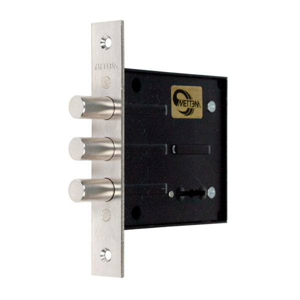 Замок имеет одно направление запирания. Три стальных ригеля надежно фиксируют дверь. Замок комплектуется лицевой планкой из высококачественной стали, декоративными накладками из нержавеющей стали и тремя латунными ключами с пластиковыми головками.