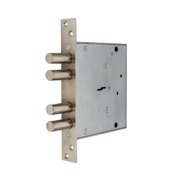 Замок запирает дверь четырьмя стальными ригелями диаметром 16 мм, которые выдвигаются из корпуса замка на 40 мм. ЗВ 165.0.0 комплектуется несъёмной стальной лицевой планкой. В комплект к замку входят четыре латунных ключа.