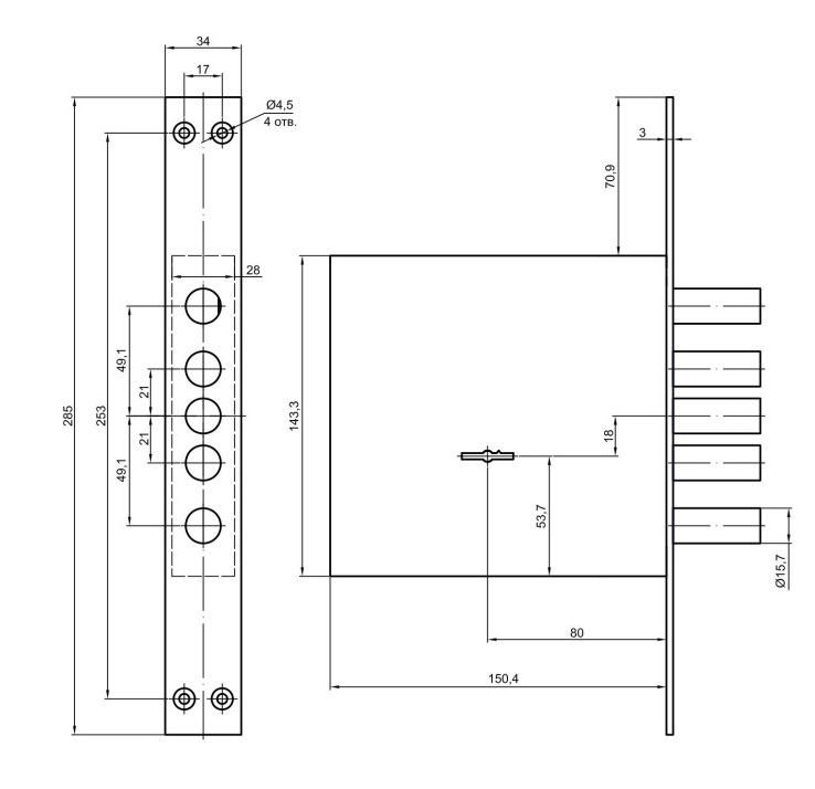 - Имеет 5 цилиндрических ригелей диаметром 15,7 мм и вылетом - 39,5 мм.