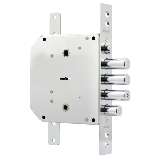 Материал замка и ключей — сталь, антикоррозийная обработка защищает механизм при неблагоприятных условиях эксплуатации, увеличивая срок службы. Лицевая планка в форме прямоугольника аккуратно обрамляет отверстие для ключа. Накладка хромированная.