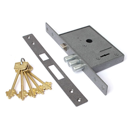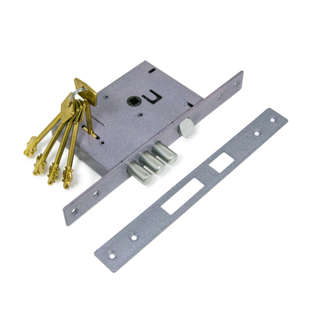 - Толщина корпуса замка 18 мм. Запирание поворотом ключа обеспечивает трехпалый ригель диаметром 12 мм;