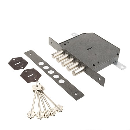 - Запирание поворотом ключа обеспечивает ригель, имеющий 5 пальцев диаметром 17 мм с вылетом 42мм.