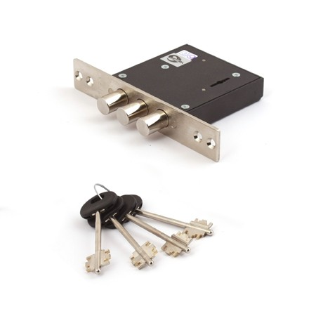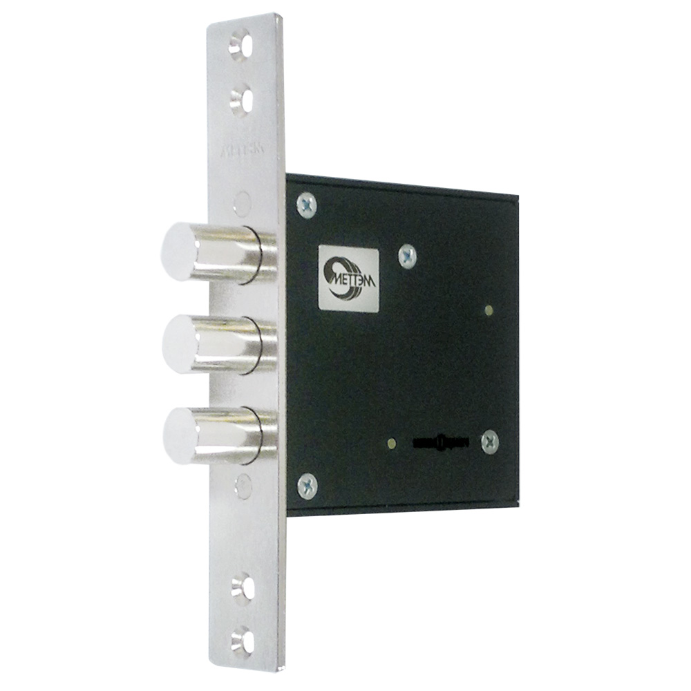 Замок имеет одно направление запирания — тремя стальными ригелями диаметром 16 мм, которые выдвигаются из корпуса замка на 22 мм. Замок запирает дверь на два полных полуоборота.