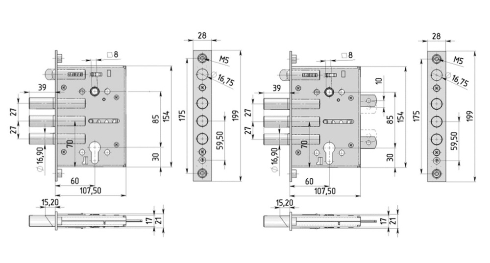 Замок имеет следующие габаритные характеристики: межосевое расстояние между серединой квадрата дверной кучки и серединой цилиндрового механизма составляет 85 мм. Удаление ключевого отверстия от торцевой планки замка составляет 60 мм. Толщина замка 21 мм.