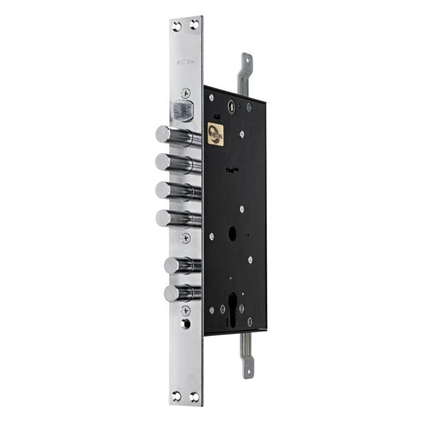 ЗВ13 173.1.1 имеет привод вертикальных тяг, которые обеспечивают дополнительное запирание в направлении вверх-вниз. Замок снабжен защелкой,поэтому может использоваться качестве основного запирающего устройства в двери.