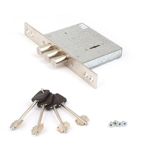 Материал замка и ключей — сталь, антикоррозийная обработка защищает механизм при неблагоприятных условиях эксплуатации, увеличивая срок службы. Лицевая планка в форме прямоугольника аккуратно обрамляет отверстие для ключа. Накладка никелированная. В комплект входит 4 ключа.