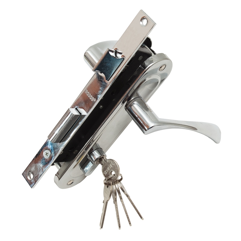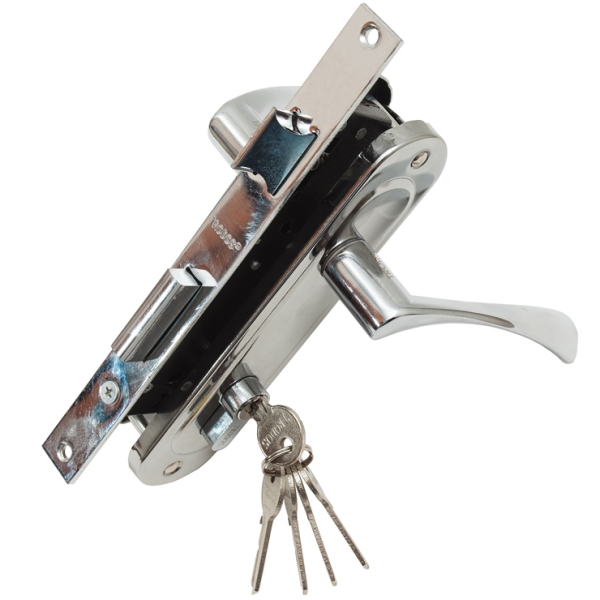 - Комплектация: цилиндровый механизм 60 мм, ключ-ключ, 5 ключей, ответная планка, винтовые стяжки.