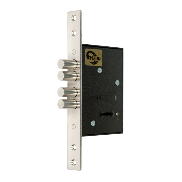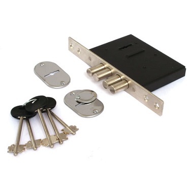 Замок комплектуется стальной лицевой планкой, а также тремя или пятью (по желанию заказчика) латунными ключами с пластиковой головкой и двумя декоративными накладками из нержавеющей стали.