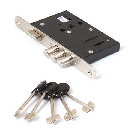 Замок комплектуется стальной лицевой планкой, а также пятью латунными ключами с пластиковой головкой.