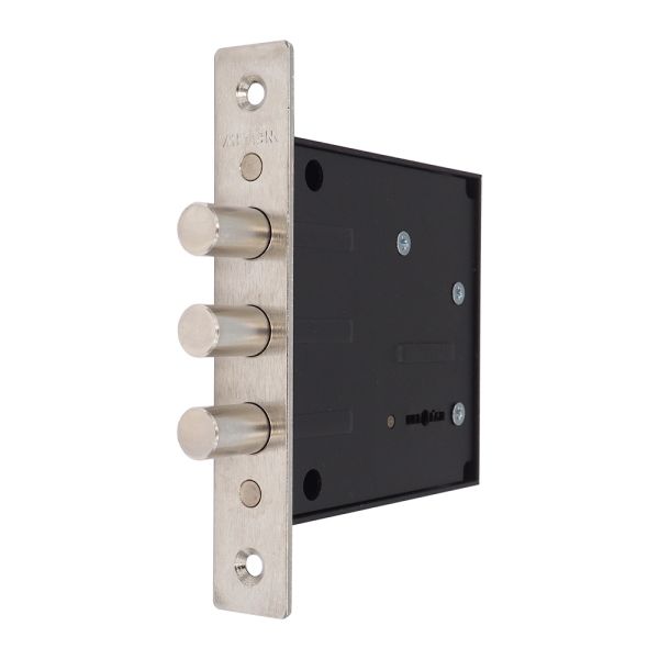 Замок имеет одно направление запирания - тремя стальными ригелями диаметром 14 мм, которые выдвигаются из корпуса замка на 22 мм. Замок запирает дверь на два полных полуоборота.