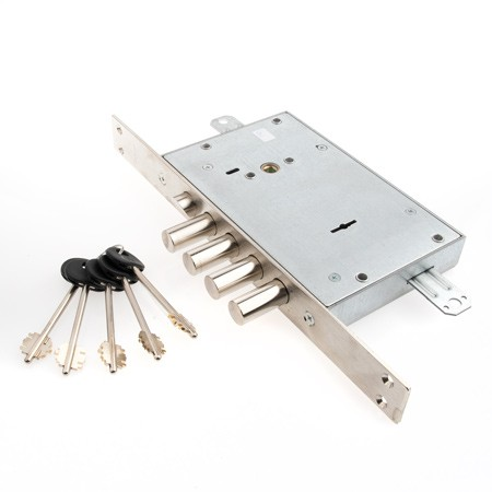 Замок запирает дверь четырьмя стальными ригелями диаметром 18 мм, которые выдвигаются из корпуса замка на 36 мм. В одном из ригелей - закаленный стальной стержень, обеспечивающий защиту от перепиливания.