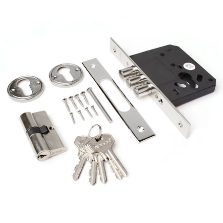 Замок врезной цилиндровый универсальный Apecs 91/60-CR общего назначения, с тремя круглыми ригелями диаметром 14 мм и вылетом 30 мм, бэксет 50 мм в комплектации с ответной планкой, накладками на ключевины, а также цилиндровым механизмом "ключ-ключ" размером 60(30/30). Цвет - хром. Класс взломостойкости 2.